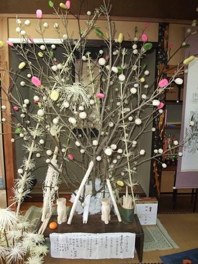 養蚕が盛んだった群馬県では、旧正月に米粉をまるめた繭玉をつくり、養蚕の豊作を願って木に刺して飾りにしたそうで、今でも東吾妻地方などでは伝統行事として引き継がれています。最近では野菜からの自然な色で着色した色とりどりの繭玉を飾ることも。作り方は簡単。米粉を熱湯で溶いて丸めたあと、茹でるだけ。白くてかわいく美しい繭玉は、正月飾りとしてだけでなく、手軽につくれるおやつとしても人気だったようです。近所の子どもたちのおやつとして、きつい農作業の合間の腹持ちのいいおやつとしても食べられていました。茹で上がった繭玉を砂糖や砂糖醤油で食べると温かくてほのかな甘みが口の中に広がります。米が貴重だった昔はヒエやとうもろこしの粉で作っていたこともあるそうですが、やはり米の白さと甘さが繭玉にはぴったり。豊かな毎日に感謝して、素朴な甘さをいただきたいと思います。