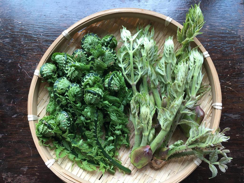 今日の聞き書きは群馬県南西部の神流川沿いに広がる山里、神流町(かんなまち)にて。その昔、特に山里では冬の間、生野菜を口にすることはなく、野菜といえば大根や白菜の漬けものでした。春になり、久しぶりに口にする青物が山菜で、「どこの家でも食べるのを楽しみにしていた」もの。おひたしやごま和えなどさまざまな食べ方がありますが、春の訪れを祝う特別な「おごっつぉー(ごちそう)」が“つけ揚げ”でした。具材に衣をつけて揚げるからつけ揚げ(天ぷらのことです)。高温の油でさっと揚げると、ふきのとうやタラの芽などはまろやかなほろ苦さに。ノビルやにんじんのかき揚げは甘く、また旬のしいたけやよもぎ、菜花なども加えれば、山里の春を楽しむぜいたくなてんぷら盛りの完成です。