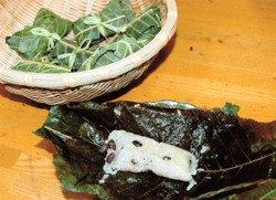 群馬県南西部の奥多野地域に伝わる「つとっこ」は、もち米に小豆を入れ、栃の葉に包み、割いたしゅろの葉でしばって茹で上げたもの。ちまきに近いお料理で、ふくらんだ蝶のようなかたちの葉っぱをむいて中のおこわを食べると、栃の葉のさわやかな風味が口の中いっぱいに広がります。東日本に昔から自生する栃の木、その大きな葉っぱがまだ若くてやわらかいときがもち米を包むのにちょうどいいそうです。