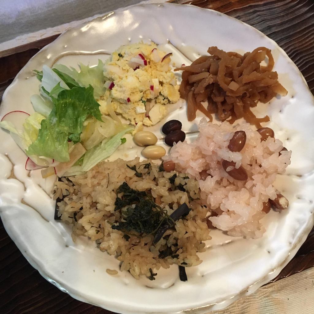※写真は、はつみ商店さんの「なんもく村のお惣菜プレート」。お赤飯の隣りが「わらびと山椒の炊き込み飯」です。