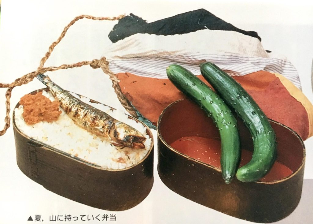 「男しょうは山弁当を持って山の畑に出かけ、昼には帰らない。弁当は、冬の間に縫っておいた、はしきれを使った丸袋に入れていく。両めんぱ(曲げものの弁当箱)に麦飯を詰め、目刺しの焼いたのと味噌を入れ、きゅうりの二本も丸ごと持っていく。そのほかにひえ焼きもち二、三個も持っていって、こじはん(小昼)に食べる。」