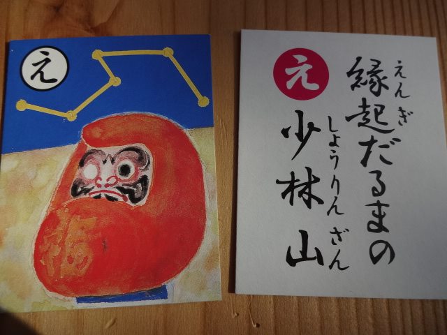 高崎市の少林山達磨寺では毎年正月6日から7日にかけて「だるま市」が夜通し行われます。群馬のたいていの家庭にはひとつやふたつはあるのではないかというくらいポピュラーなだるま。このお寺は北極星や北斗七星を崇める北斗信仰のお寺でもあり、絵札にはだるまさんと北斗七星が描かれています。