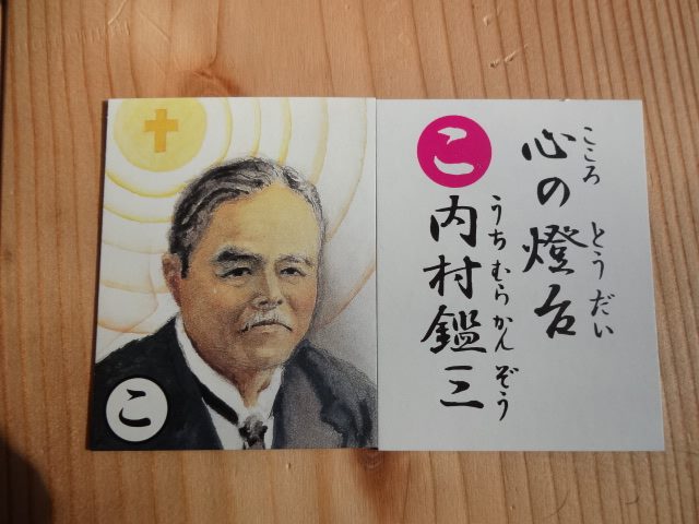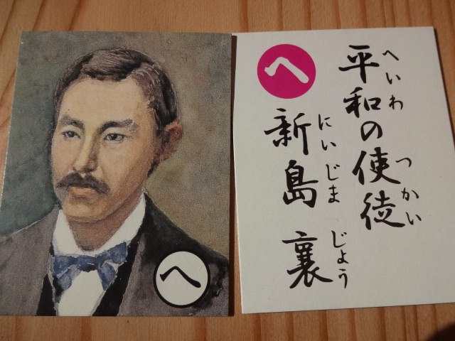 自由の精神にあふれ、学生の自治を重視する同志社大学を創設した新島襄は群馬県安中の生まれです。1864年、国禁を犯して渡米し、キリスト教教育者となって明治時代の日本に戻り、布教と教育に努めました。国家や宗教も超えて自由と平和を追求したその教えは「非戦の牧師」として有名な柏木義円を通じて故郷・安中でも受け継がれました。この読み札の原案者は義円から受洗した須田清基牧師と言われています。襄から義円へと連なる人々を「平和の使徒」と呼ぶことに万感の思いを込めたのでしょう。