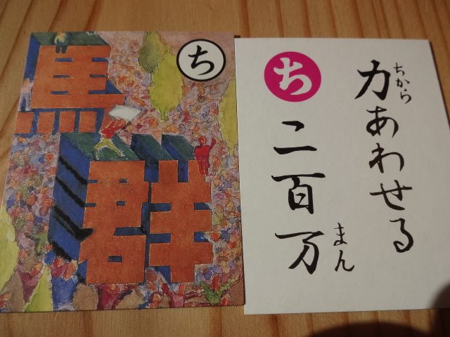 出ました、役札! 花札じゃないんだから役なんてないのですが、かるた取りしながら、誰もがねらっている札と、そうでもないマイナーな札とはやっぱりあって、「ち」は間違いなく本命のひとつでした。この札に勝てるのは「鶴舞うかたちの群馬県」くらいか!笑