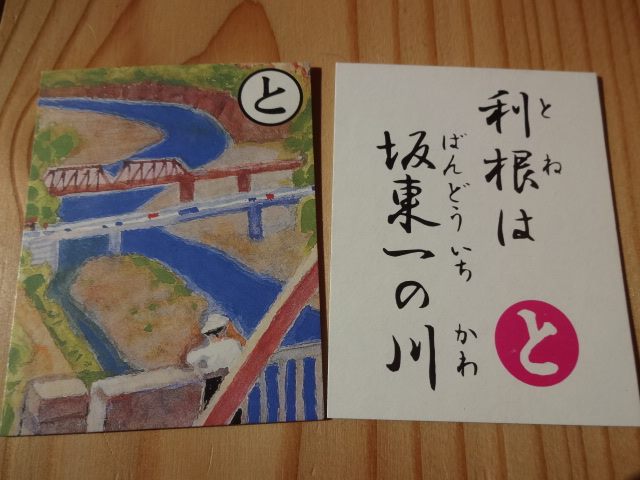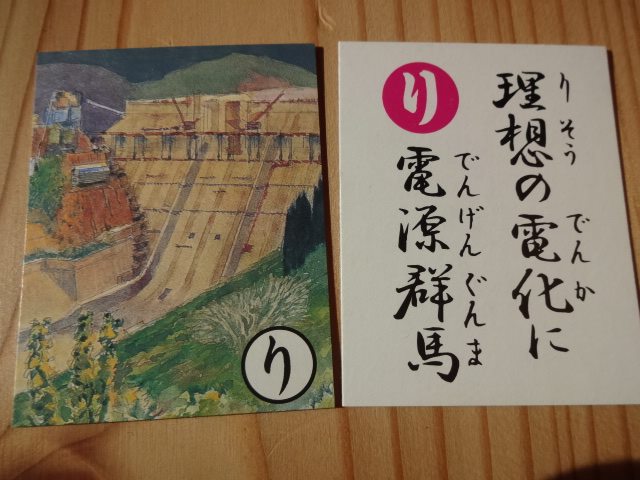 濁音交じりの読み札が耳に残る一枚です。今となっては、ダム建設にも、電力頼みの生活にも、もろ手をあげて賛成というわけにはいかない時代になりましたが、この絵札に描かれた下久保ダムの着工は1959年。戦後の新たな開墾地に次々と電灯のあかりを燈すべく、巨大な建造物を人の手で生み出していくことへの当時の強い情熱と大きな希望は想像にかたくありません。