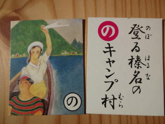 戦争を経験してきた上毛かるた製作者たちの目には、この平和でのどかな風景がどれほど大切で愛しいものに見えたことでしょうか。美しい榛名富士をバックに、湖面でボートを楽しむ若者の姿を描いた札です。