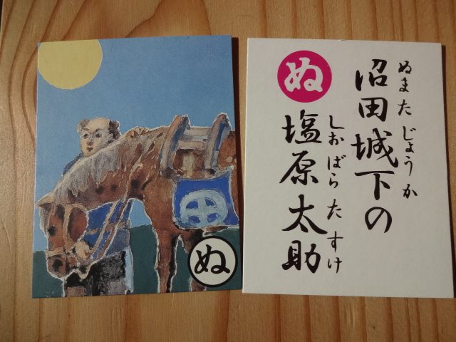 塩原太助は無一文から出発して大商家を興しながら、終生謙虚に生き続けた人物として明治時代の落語や読み物の出世譚で大人気を博した人物です。絵札になっているのは愛馬アオと別れ、江戸へ立つシーン。実家で継母からいじめられ、あげくに殺されそうになった太助の危機を馬特有の特殊な能力で察知し、何度も助けてくれたアオとの名場面は太助物語の前半のハイライト。太助がのちに全国各地に灯篭や石畳を敷いて社会貢献したのは人間だけでなく馬への恩返しをしたかったからなのかもしれません。