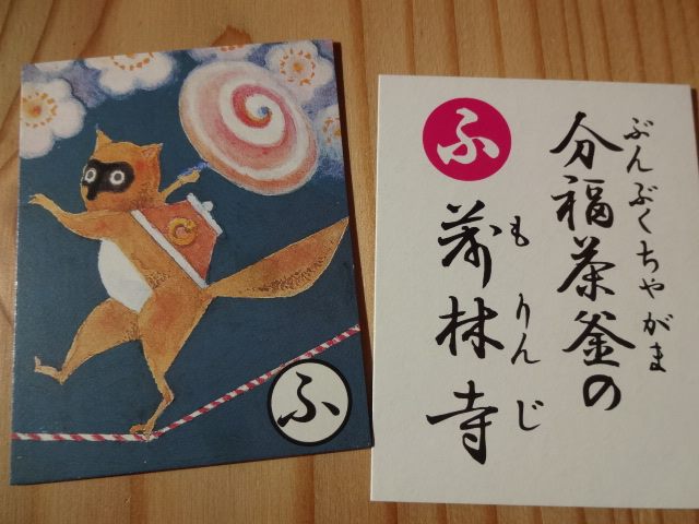 館林市にある茂林寺はタヌキ伝説のお寺です。絵札は、助けてもらった恩返しに茶釜に化けて曲芸を見せるタヌキ君。愛くるしい茶釜タヌキ君はじつは一生をこの姿のまま過ごし、死後も茂林寺で大事にされて、今に伝わっています。この茶釜で湯を沸かし、集まった人たちに茶をふるまうとどんなに汲んでも湯がなくならず、また福を分かち合う力があることから「分福茶釜」と名づけられたそうです。