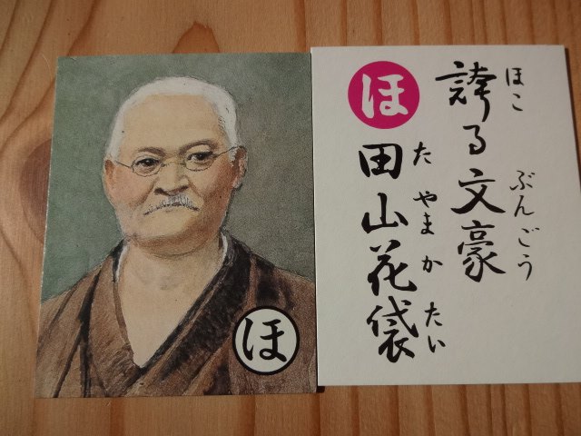 ついに田山花袋の回が来てしまいました。うーん、書くことがない。絵札も地味だし、どうもこの札は若山少年にはもうひとつ人気がありませんでした。ただし、新島襄や内村鑑三に比べると、「人物札」としては見分けやすかったため、取りやすい札ではありました。そして、取ることができるたびに頭の中で「文豪っていえば夏目漱石??」という突っ込みのセリフが浮かんでしまうのでした。小説といえば、血沸き肉躍る冒険譚ばかりを読んでいた若山少年は夏目漱石もろくろく読んでいなかったにもかかわらず…。