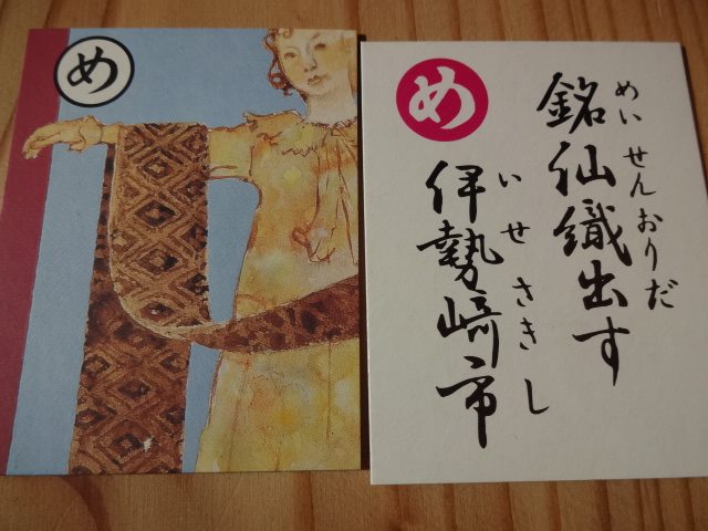 大正から昭和初期にかけて関東地方の女性の着物生地として有名だった伊勢崎銘仙。素朴で親しみがあり、丈夫でおしゃれなことから人気を博しました。戦後、和服用の絹織物は需要が減っていきましたが、自由な精神と伝統を大切にする心を持ち続けてほしいという願いを込めて、絵札には洋装の女性が反物を紹介する姿が描かれています。