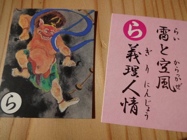 ちなみにもう一枚赤く染められた読み札があり、それは「ら」です。「雷(らい)とから風 義理人情」は風神が描かれた力強い絵札ですが、そこにはGHQの許可がおりずに入れられなかった小栗上野介や国定忠治たちの面影をひそかに雷神に託したと言われています。