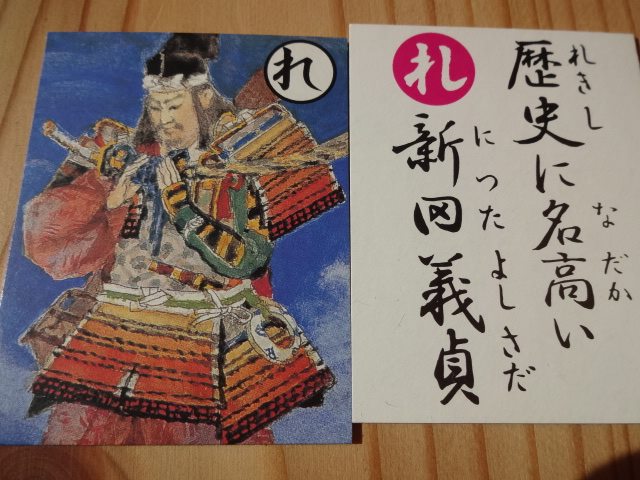 清廉と誠実をつらぬいた武将として、楠木正成とともに人気の高い人物です。GHQはかるたに武士を読み込むことを禁止していましたが、粘り強い交渉の末、たった一枚だけ許された、武士の人物札です。絵札に描かれているのは、鎌倉幕府に攻め入る直前、稲村ケ崎に黄金の刀を投げ入れる「太平記」の1シーン。「ら」の札に続いて、上毛かるた制作者たちの、時代を越えた願いや祈りが宿っている一枚です。