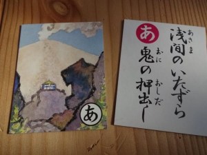 天明の大飢饉を引き起こした1783年の浅間山大噴火。このとき火口で鬼たちが暴れて押し出した岩が生んだ奇勝。見渡すかぎりゴツゴツの火山岩が広がる景色は異様な雰囲気です。浅間山は標高2568m、長野と群馬の県境にまたがる美しい山で、ぼくにとっては富士山よりも浅間山こそ最高の名峰です。「大噴火で上が吹っ飛ぶ前は浅間のほうが富士山より高かったんだぞ」という妙な自慢をしていたのが、この札にまつわる若山シュウ君の小学校の思い出です。