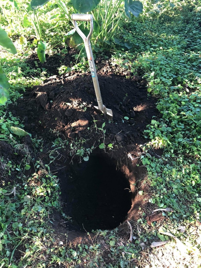 農家さんで穴掘りをしました。ふだんは畑として使っていないエリアで、なかなか地盤が固い。