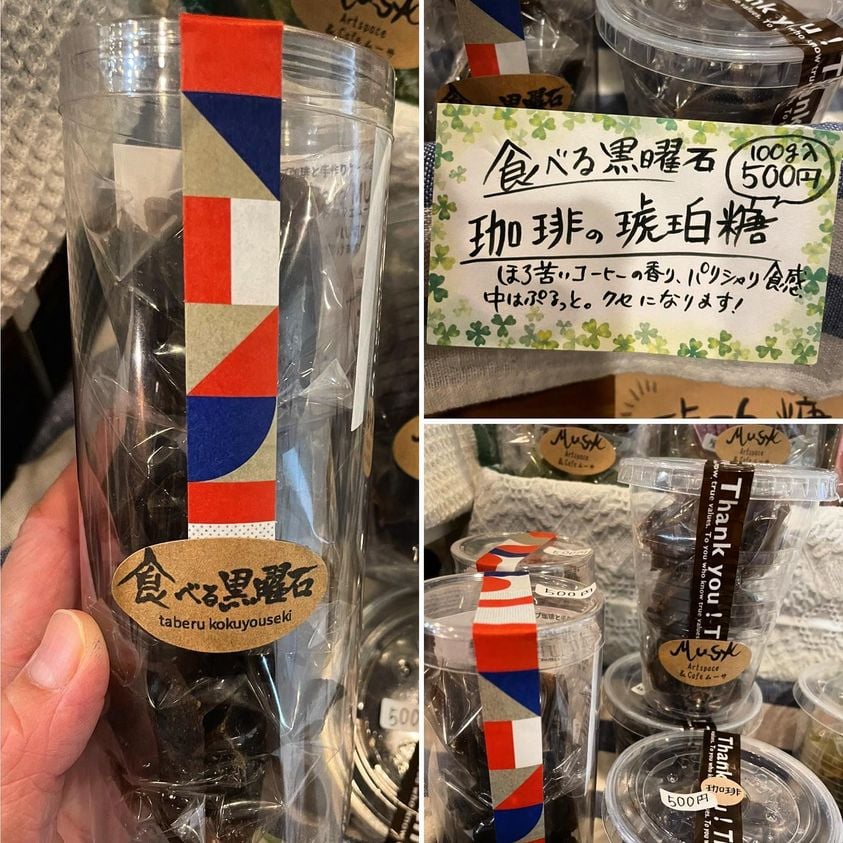 その名も「食べる黒曜石」。黒曜石の産地、北海道の赤井川村の道の駅でも販売されている、シャリっとおいしいコーヒー味の琥珀糖です。