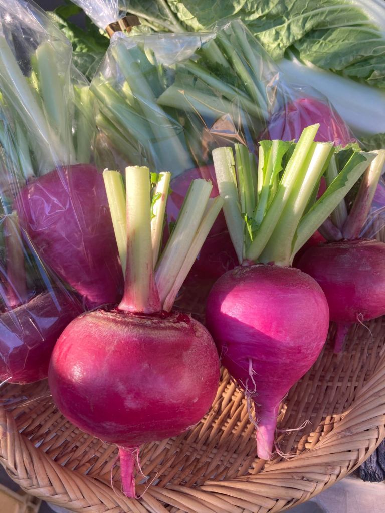 ・大根(無農薬のもの/減農薬のもの)、カラフル大根:紫、黒丸、紅くるり、紅芯、紅三太、緑、茜山三月、聖護院