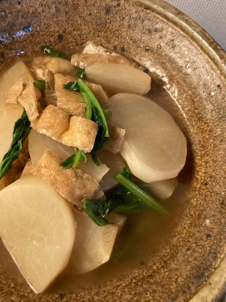 ②だしを鍋に温めて油揚げをいれ、2分くらい煮る。カブを加え、5~6分、カブが柔らかくなるまで煮る。(落とし蓋をするか、たまに上下を返す)