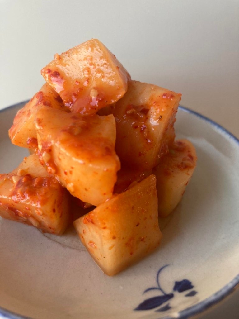③大根の重量の3%の塩をして、出てきた水分をよく切り、キムチの素を和えるだ