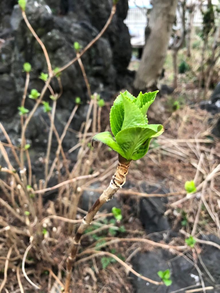 なかでも、店主が好きなのはアジサイの芽。冬の間は、まるで枯れてしまった一年草のように茶色の枝だけだったのに、春になると薄緑色のやわらかそうな芽をつけるのが毎年、毎年、不思議に見えてなりません。これが6月、梅雨のころに雨の中で美しく咲き誇る、あの大きな花々になるのかと思うとなおさらです。
