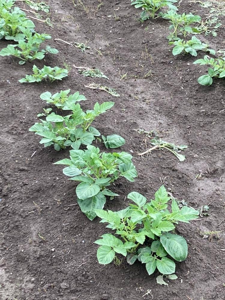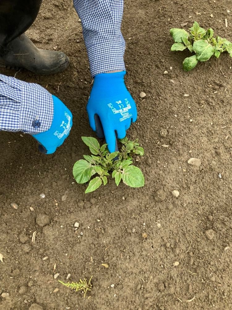 先日は「芽かき」というものをやってきました。種芋を植えるとき、芽を4つ残して植えると、葉っぱが4つ出てきます。そのうち、良い2つを残し、2つをとりのぞきます。
