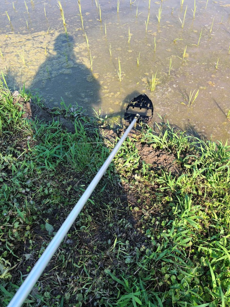 いろいろなタイプがあるようですが、今回購入したのはとても軽いタイプ。また、通常の八反ころがしが草を泥の中に練り込んでいくのに対し、これは草を浮かせる仕様になっていて、泥の中を押していくときにも通常のものより軽い力で押せます。
