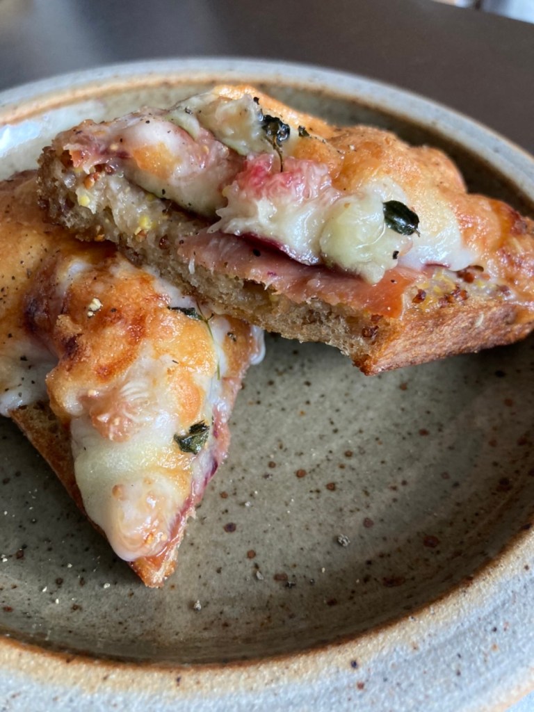 上記の順番でパンに乗せていき、200°Cのオーブンで焦げ目がつくまで焼きます。