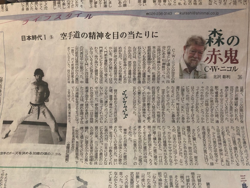 帰宅し、八百屋の道具を整理していると、たまたま目についた古新聞にニコルさんの記事。若き日のニコルさんが空手の仲間に連れられて、雪山に入ったとき、「幼いころに祖母から聞かされた、森の力が日本にはまだ残っているんだ」と感動した話が書かれていました。