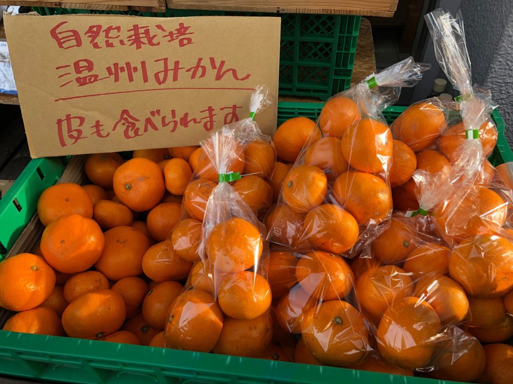 温州みかんは瀬戸内海の小島で自然栽培をしている「しあわせ畑あかば」さんから。おばあさんから受け継いだ島の畑でたぬきやカラスを始めとした生きものたちと共生して柑橘を育てています。温州みかんは強い甘みとわずかな酸味のバランスが絶妙です。好きな人は皮ごと食べてしまうほど。中身だけ食べて甘さを感じ、皮と一緒に食べて苦みもプラス、さらに皮だけをちょっと食べてみる。そしてまた中身だけ食べて口直し。店主はこんな食べ方で楽しんでいます。